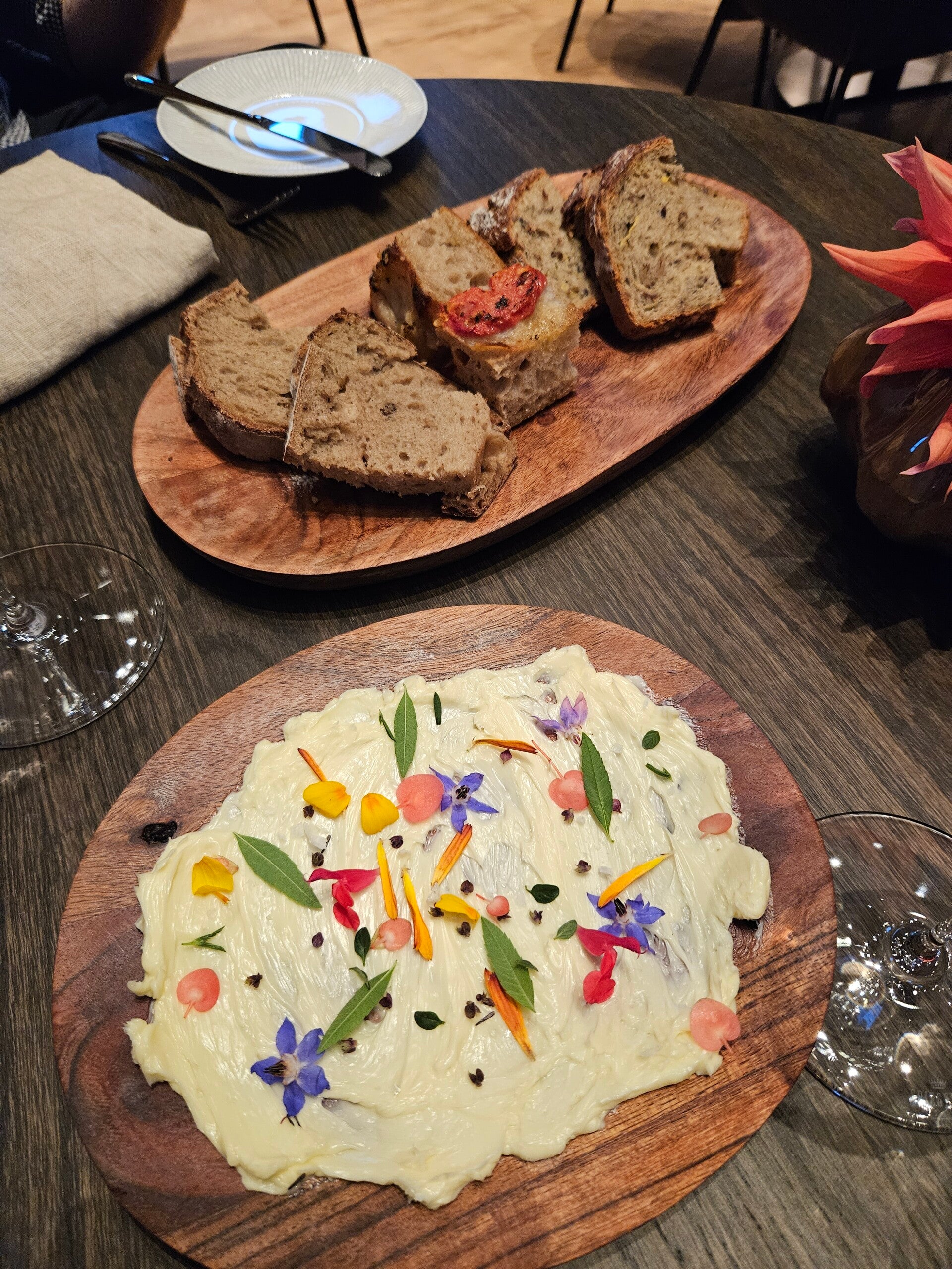 Hausgebackenes Sauerteigbrot,Salzbutter, Wildblüten
