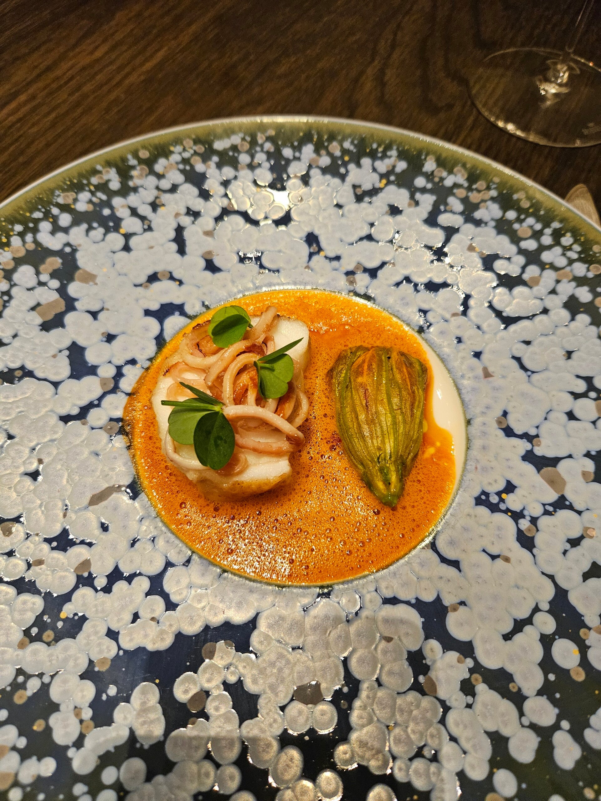 Gefüllte Zucchiniblüte, Krustentierschaum, Kabeljau, Calamari