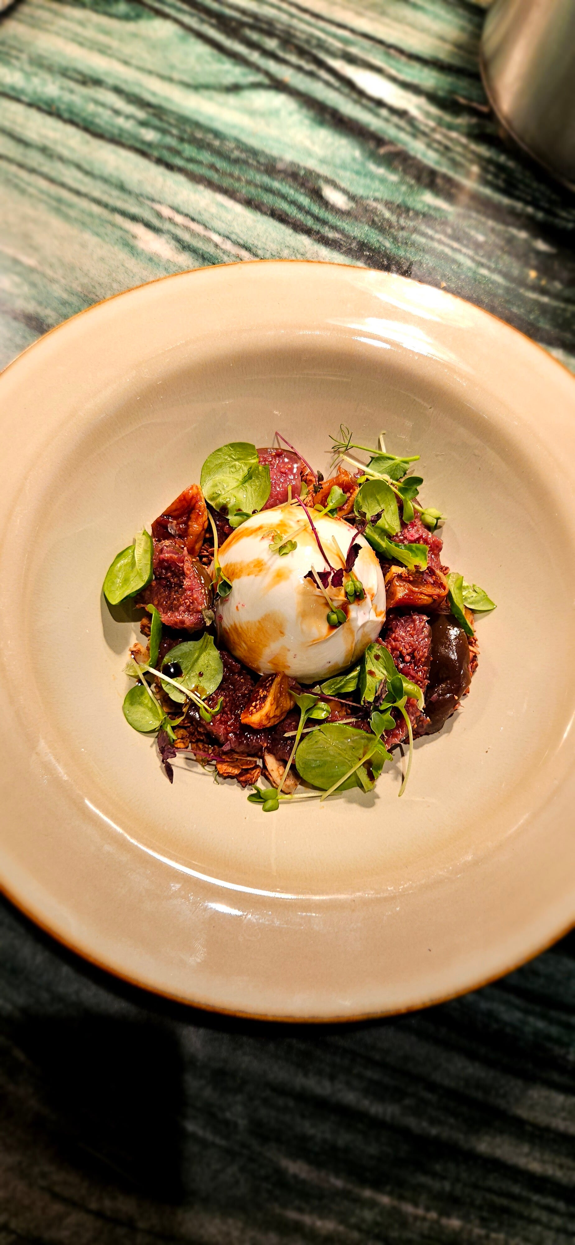 Büffel-Tatar,Störkaviar, gebackens Ei, Jus